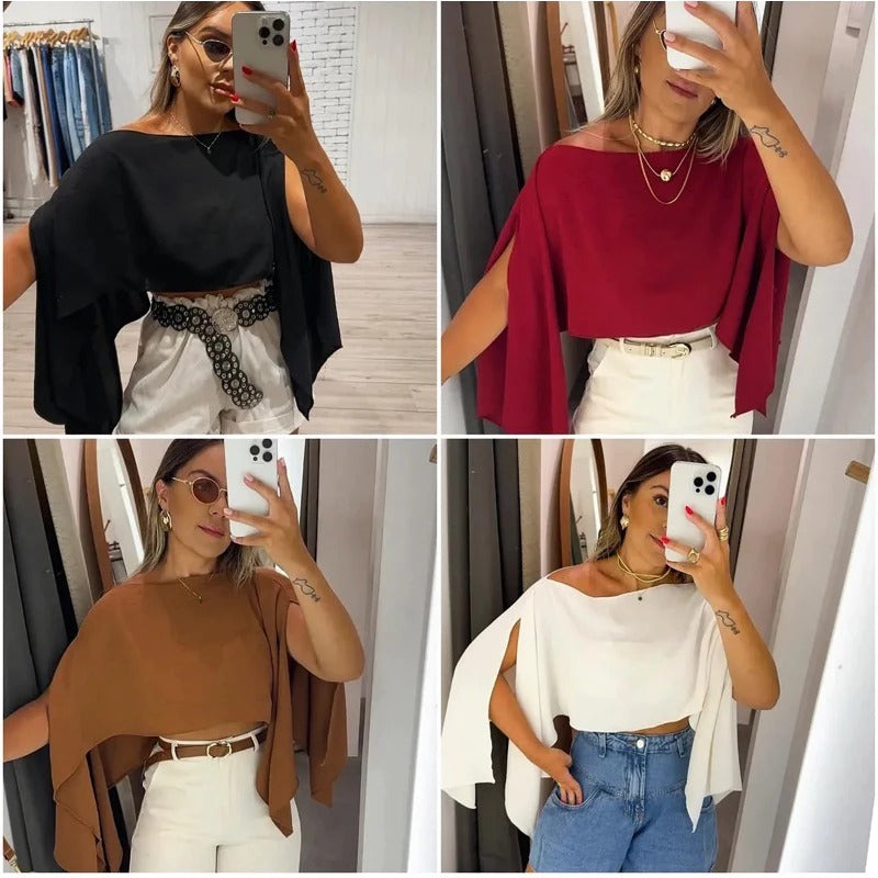 Compre Bata boho chic assimétrico Multiuso Multiforma blusa feminina Batinha Moda Gringa P44 na Shopee Brasil! Cropped capa (Não vem o Top) é com certeza um dos mais versáteis vistos por aqui! O top serve como forro, e possui elástico nas extremidades. O cropped tem recortes e uma modelagem que permite usar de várias formas! Em crepe.