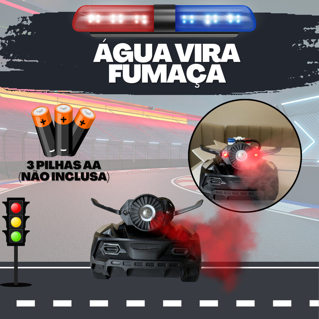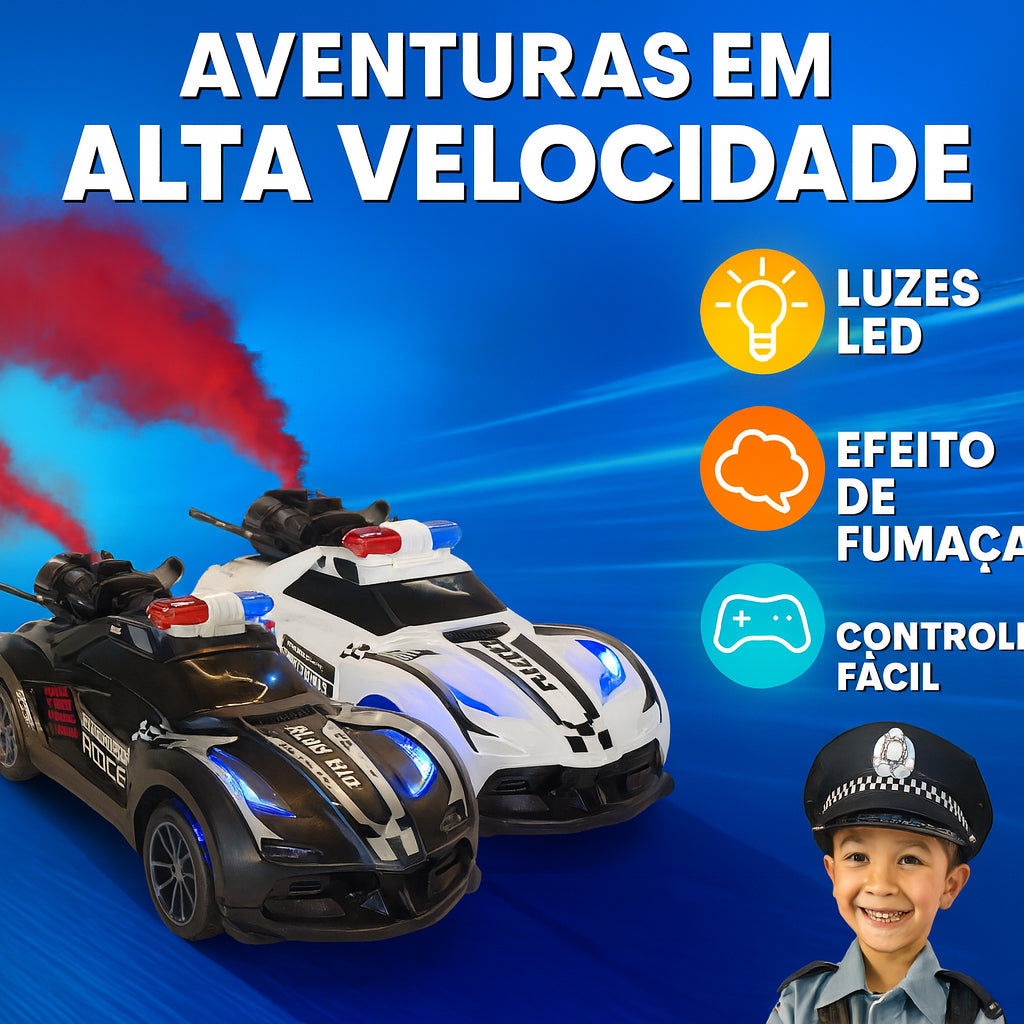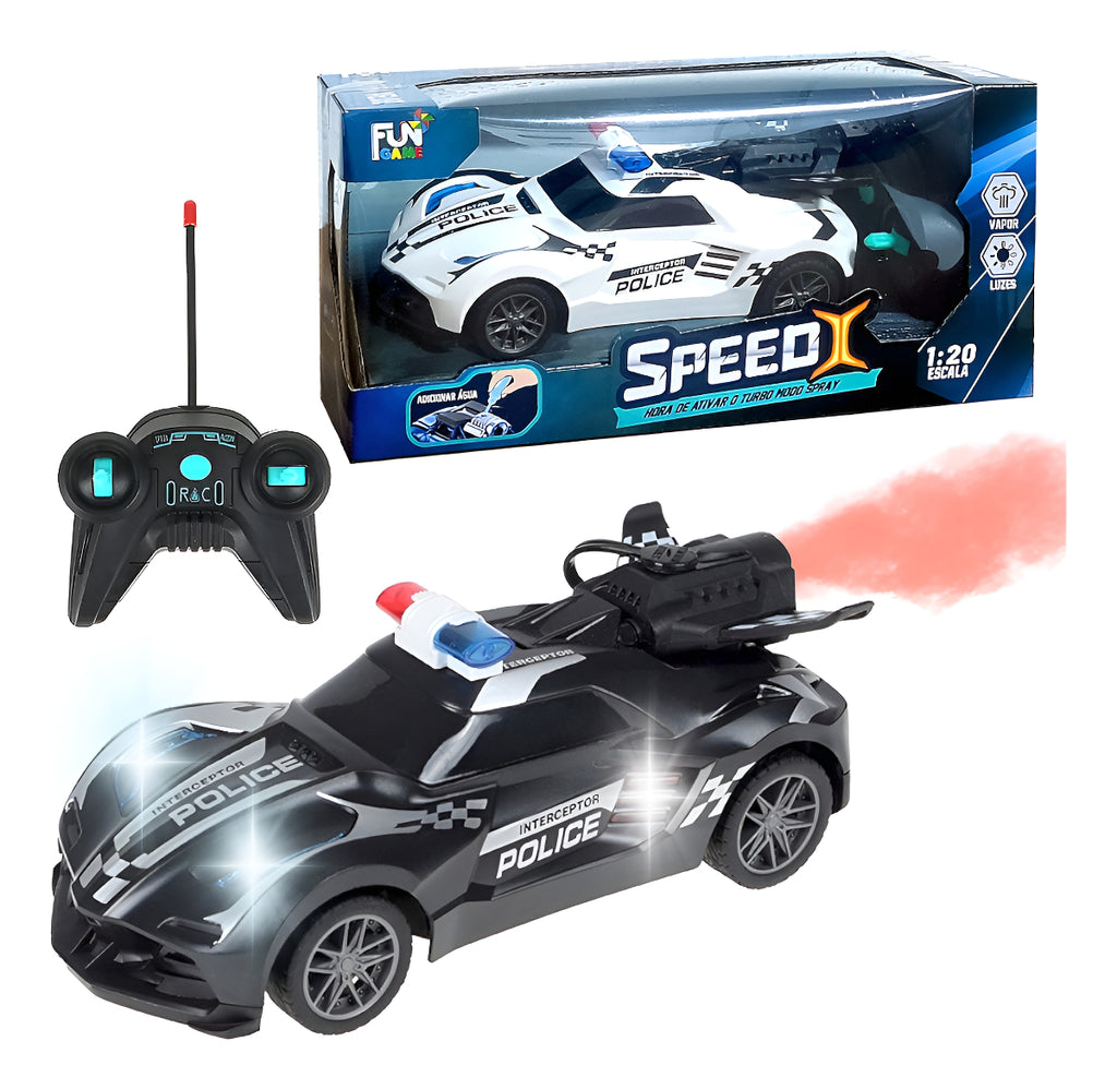 Carrinho de Controle Remoto Polícia que Solta Fumaça Com Luzes. Este brinquedo sem fio é perfeito para as crianças se divertirem. O carrinho pode andar para frente, para trás, virar à direita e à esquerda, e solta vapor pela turbina. Além disso, possui pneus emborrachados e é feito com materiais de alta qualidade para proporcionar uma diversão duradoura.