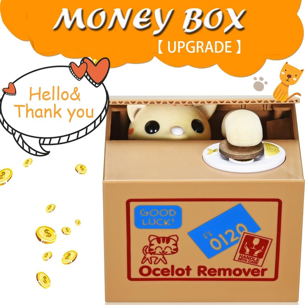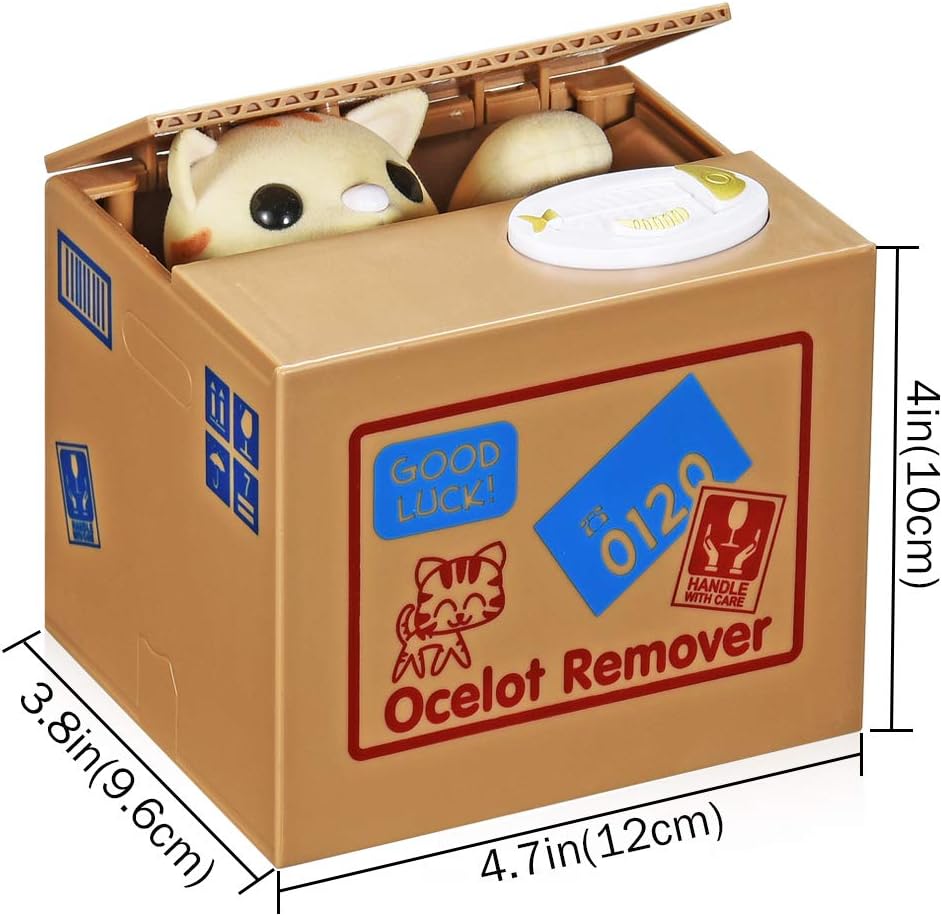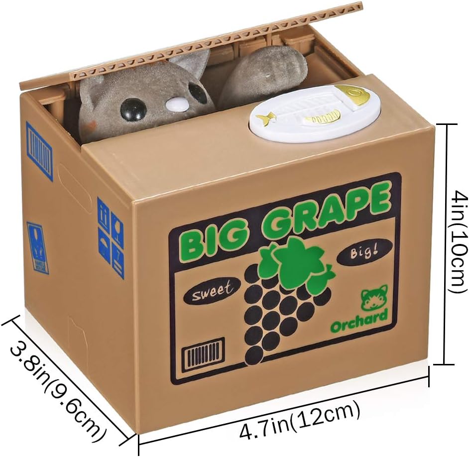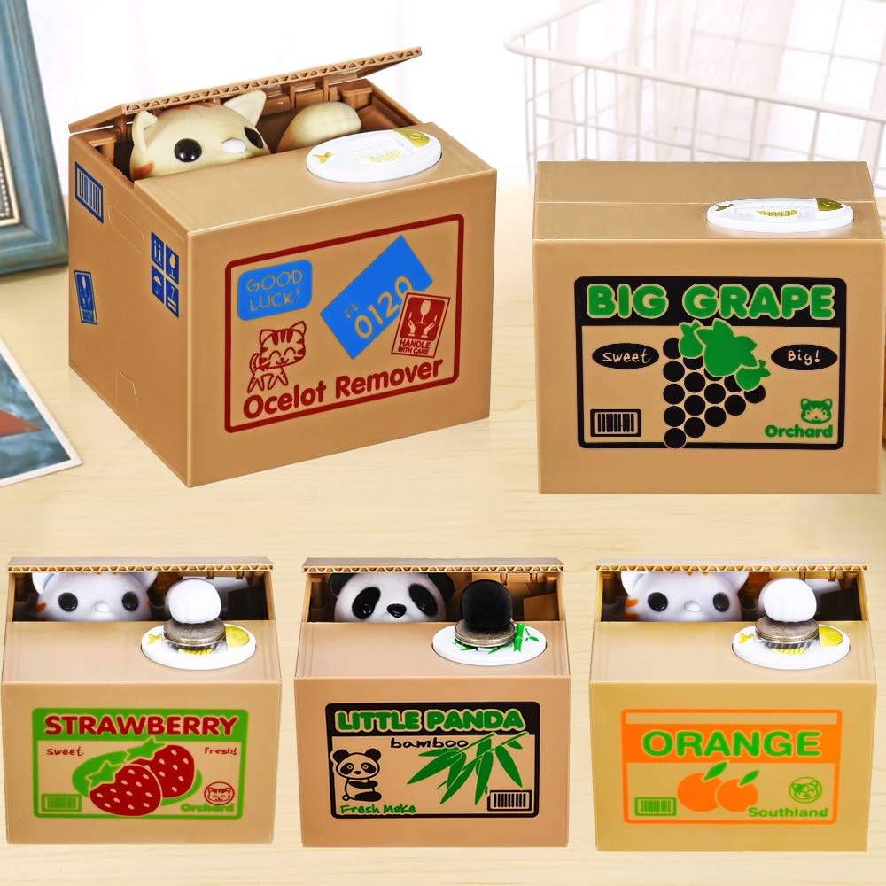 - 【How do they steal】 - Ask your little kid to put one coin on the top of button then press it. The kitty of this automatic stealing money bank would head up and steal it. You can find more info about how this kitty “steal” money from the