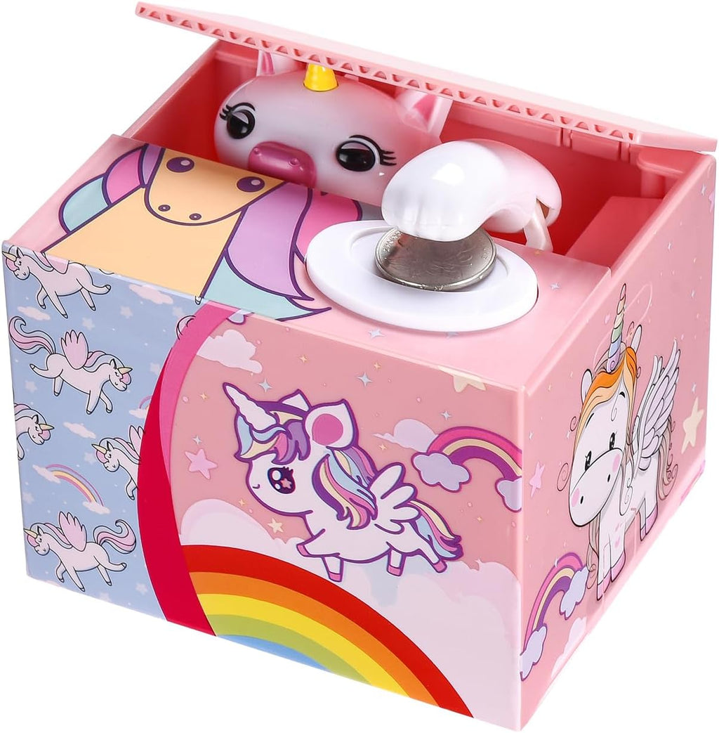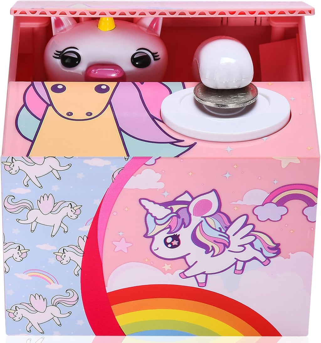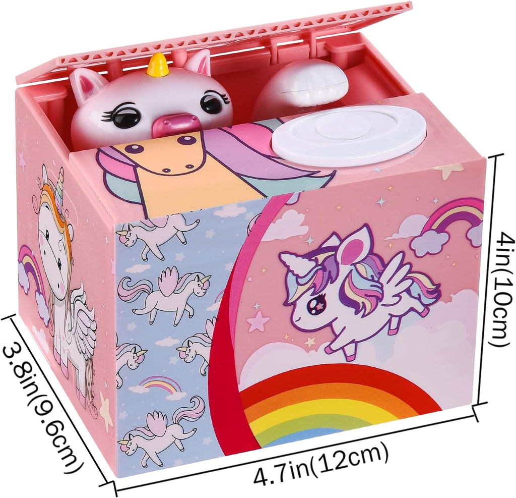 - 【Large Capacity】 - This Stealing Money Bank measuring 4.7*4.1*3.7 inch, work on all US coins can hold approximately 30 or 40 coins. This smart coin bank can be your first choice to teaching kids how to save money.