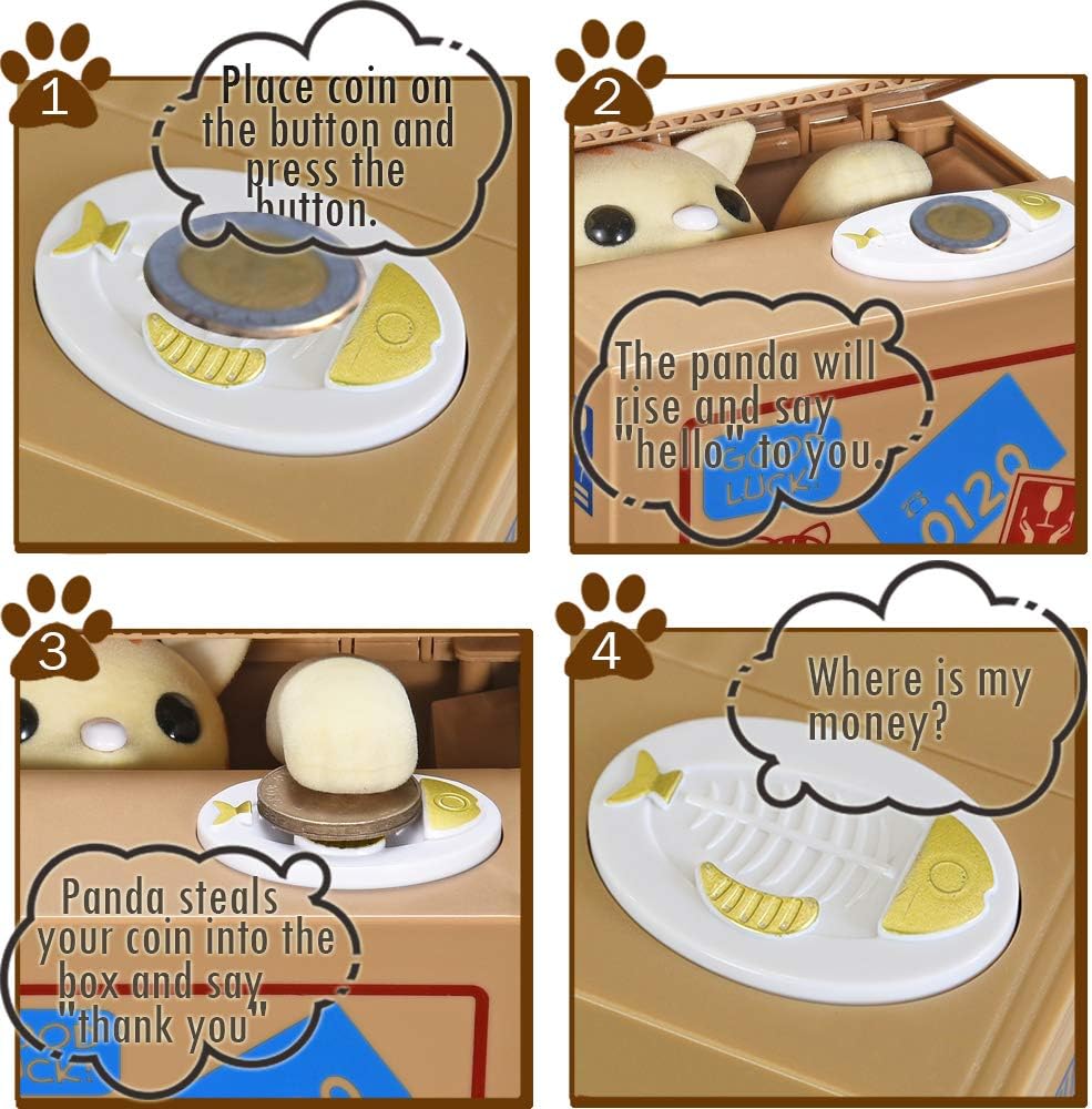 - 【Upgrade Voice Design】 - Unlike other kids money bank, this latest version coin bank features clear voice function : When you put the coins on the plate, the kitten or the panda will say a clear "Hello" . After taking away your money, it will say "Thank you", bringing much more fun to the children.