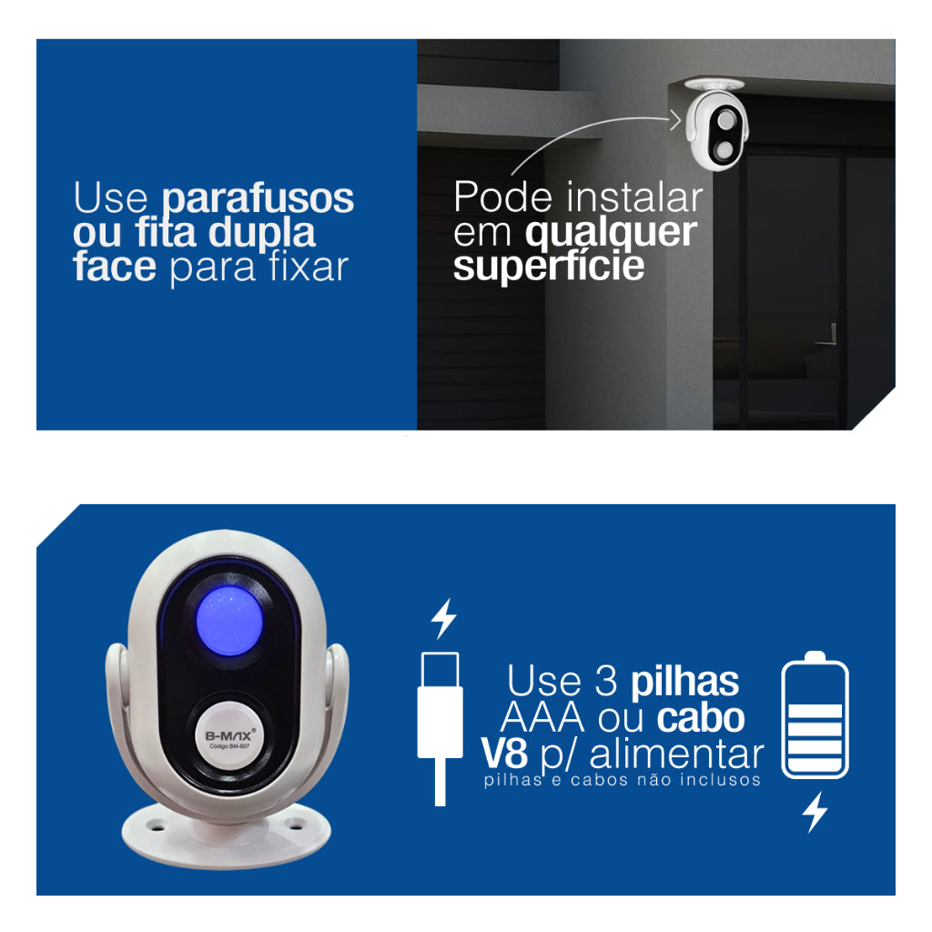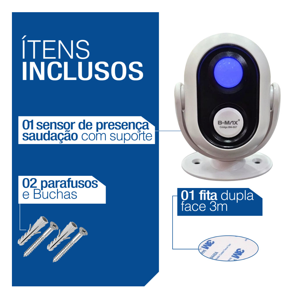 Compre Sensor De Presença inteligente Campainha Alarme Sonoro 3 em 1 >>ATENÇÃO, ESTE ANÚNCIO É . ENVIO IMEDIATO INDEPENDENTE DO HORÁRIO>> Sensor De Presença Anunciador Infravermelho 3 em 1 Modelo BM-607 Sem Fio Procurando um produto de fácil instalação, que oferece mais segurança a sua loja, empresa ou até mesmo em sua casa? Pois aqui está o anunciador e sensor de presença original da B-max!! Ele pode ser utilizado não apenas como visitante para informar, mas também como alarme anti-roubo. O sensor de presença conta com vários alertas sonoros, além de saudações de "bem vindo" em 11 idiomas diferentes. O sensor é de fácil instalação, pois é sem fio. Pode ser colocado com pilhas ou pode ser usado no cabo usb v8 de celular (plugado na tomada). Assim facilita bem mais sua instalação. Podendo colocar ele nos mais diversos locais de sua preferência. O sensor conta com uma tecnologia infravermelho que permite alcançar até 10 metros de área. ESPECIFICAÇÕES: - Cor: Branco - Idiomas: 11 - Ajuste de Volume: 4 niveis - Alimentação: 3 Pilhas AAA ou Fonte de Energia 5V - Altura: 10 cm - Largura: 7 cm ITENS INCLUSOS: - 01 Sensor de Presença Alarme Sem Fio. - 01 Suporte. - 02 Parafusos. - 01 Fita Dupla Face. GARANTIA DE 3 MESES DIRETAMENTE CONOSCO.